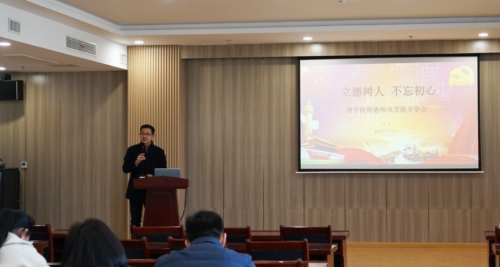 在强调学习习近平总书记关于教育论述精神理论学习的同时,学院也组织了相应的师德教育活动,在开展关于师德优秀典型先进事迹宣传学习的交流活动中,宣传以张桂梅女士“只要还有一口气就要站在讲台上,九死亦无悔”为典型的师德优秀模范事迹,面向广大教师生动讲好师德故事,用师德榜样传递师德的力量,引导教师见贤思齐,从“被感动”到“见行动”,努力争做坚定理想信念、厚植爱国情怀、涵养高尚师德、为党育人为国育才的优秀教师。11月学院举办了以“立德树人、不忘初心”为主题的师德师风交流分享会,院党委书记朱金、院长戴俊带领全院教师共同学习,并分享了学习体会。万佳老师做了题目为“一”的演讲,从身边一些事例阐述了师德是一种本能是一种大繁至简,全院教师深受感动。后续还将以读书会、党日活动、书记讲党课等各种形式,以党史学习教育为主线,强化“四史”学习教育,将“四史”学习作为广大教师思想政治“必修课”。