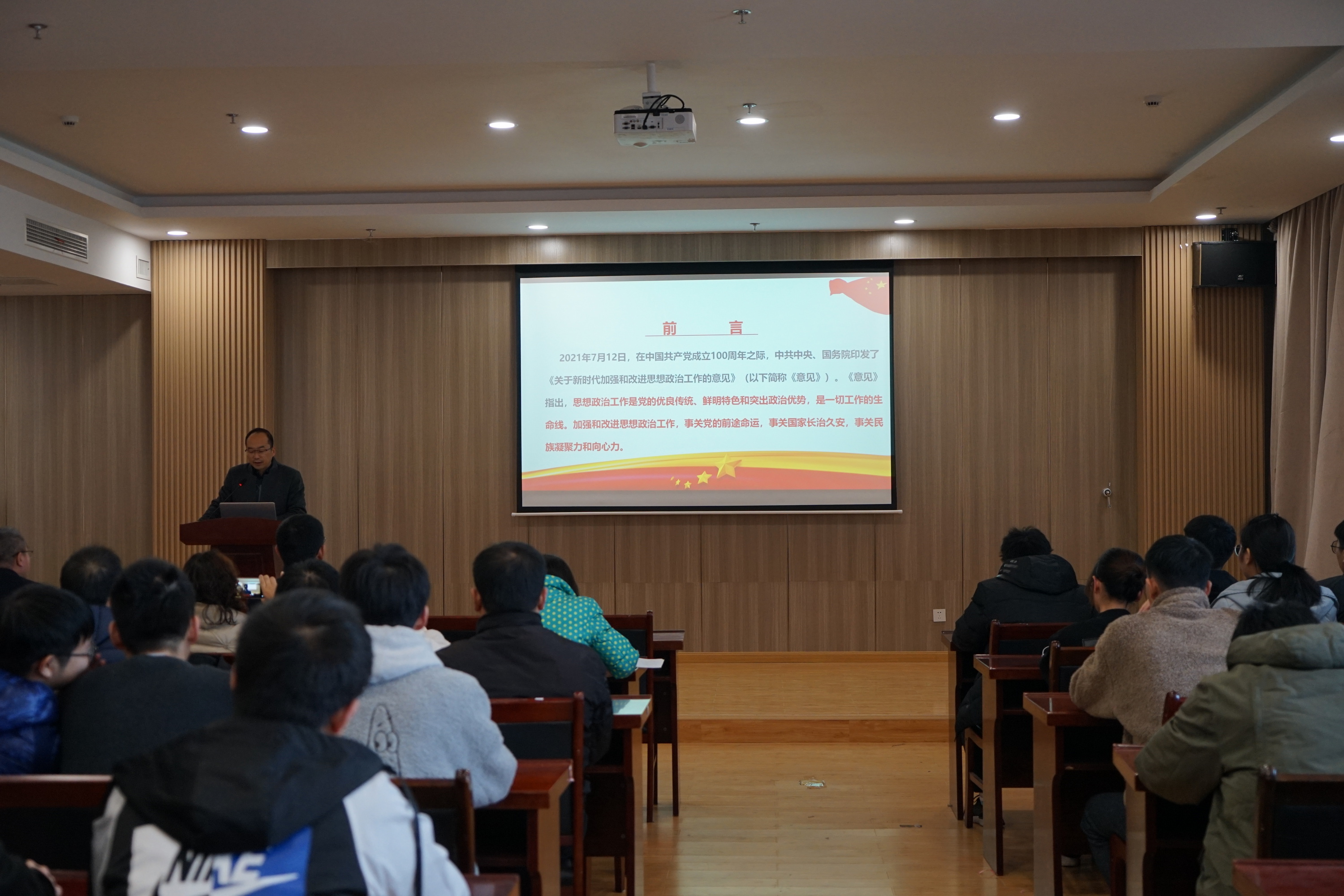 党课主题突出、内容丰富,从《意见》的出台背景开篇,从新时代加强和改进思想政治工作的指导思想、方针政策、重要方式等各个方面详细地解读了《意见》全文精神。党课最后,朱金书记号召全体教职工:学院要全员重视并做好高等教育的思想政治工作,坚持立德树人的根本宗旨。同时要加强党的建设,坚持党的全面领导,进一步明确领导干部的意识形态工作责任,牢牢掌握意识形态工作的领导权主动权,坚决守好意识形态工作“责任田”。大家要把学习贯彻党的十九届六中全会精神和思想政治工作会议精神,作为当前和今后一个时期的重要的政治任务,并将此与我院的“十四五”规划、自身发展结合起来,切实谋划做好各项工作,把党建和思想政治工作优势转化为学院的、自身的发展优势,以优异成绩迎接党的二十大胜利召开!
