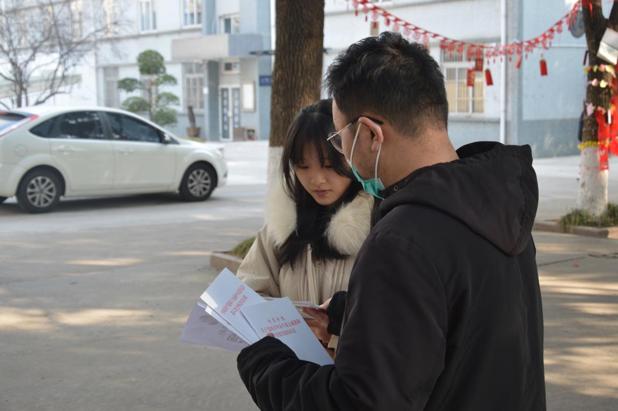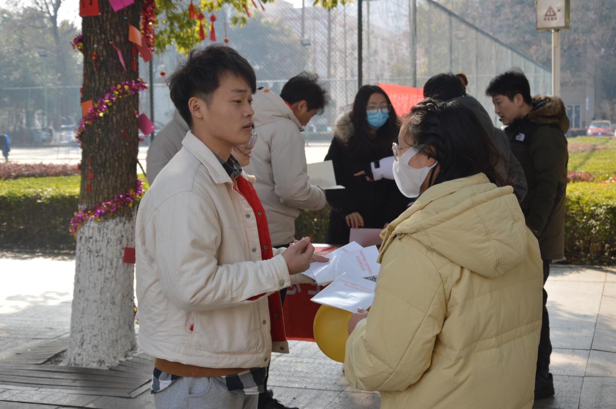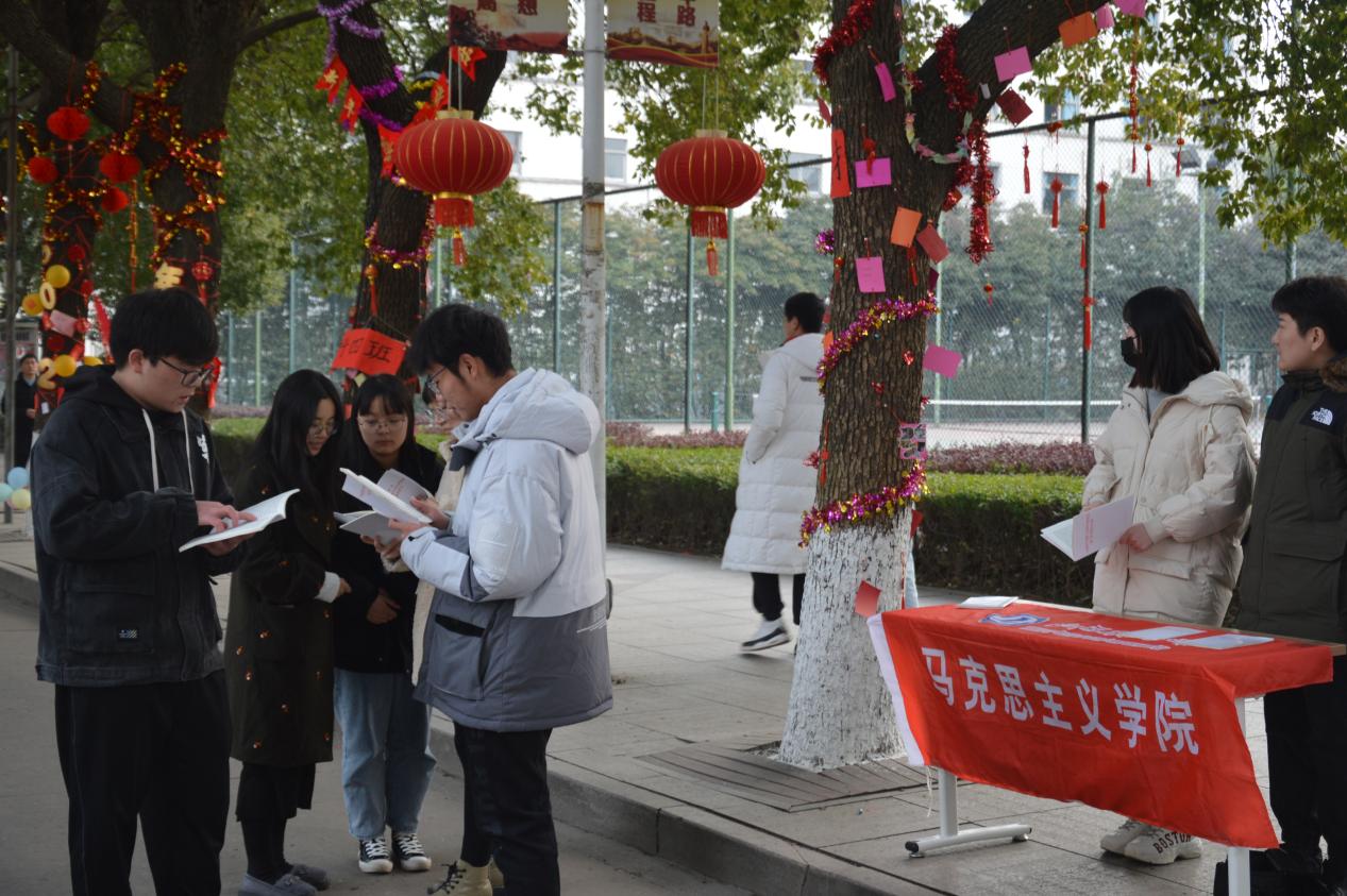 2021年12月31日中午的江科大梦溪校区,张灯结彩,喜庆祥和。马克思主义学院研究生来到校园主干道,为来往学生赠送了《中国共产党第十九届中央委员会第六次全体会议公报》和《中共中央关于党的百年奋斗重大历史成就和历史经验的决议》等学习资料,赠书之际,并就十九届六中全会的重要意义,进行微宣讲。