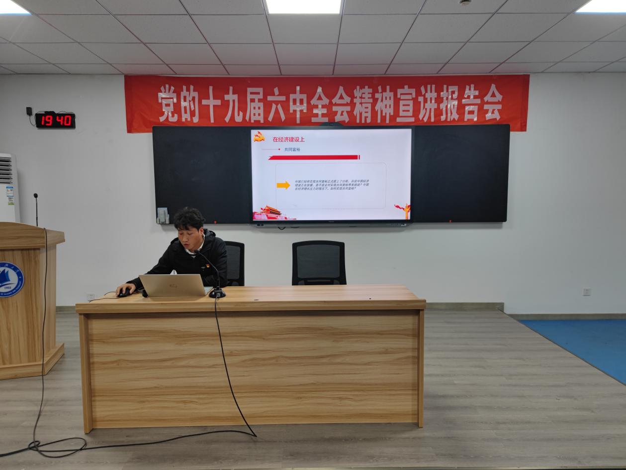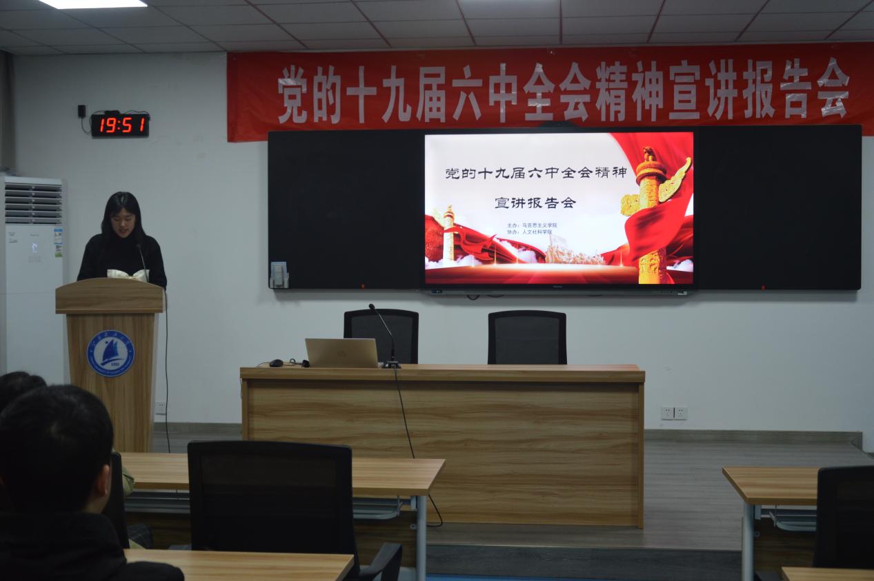 晚上7点,报告厅热情腾腾,精心准备的宣讲报告会拉开帷幕。马克思主义学院硕士研究生、镇江市青少年党史学习教育宣讲团成员姚可欣、郝宝平以及赵勇副教授陆续登台进行党的十九届六中全会精神宣讲,宣讲报告会由人文社科学院梁颖同学主持。