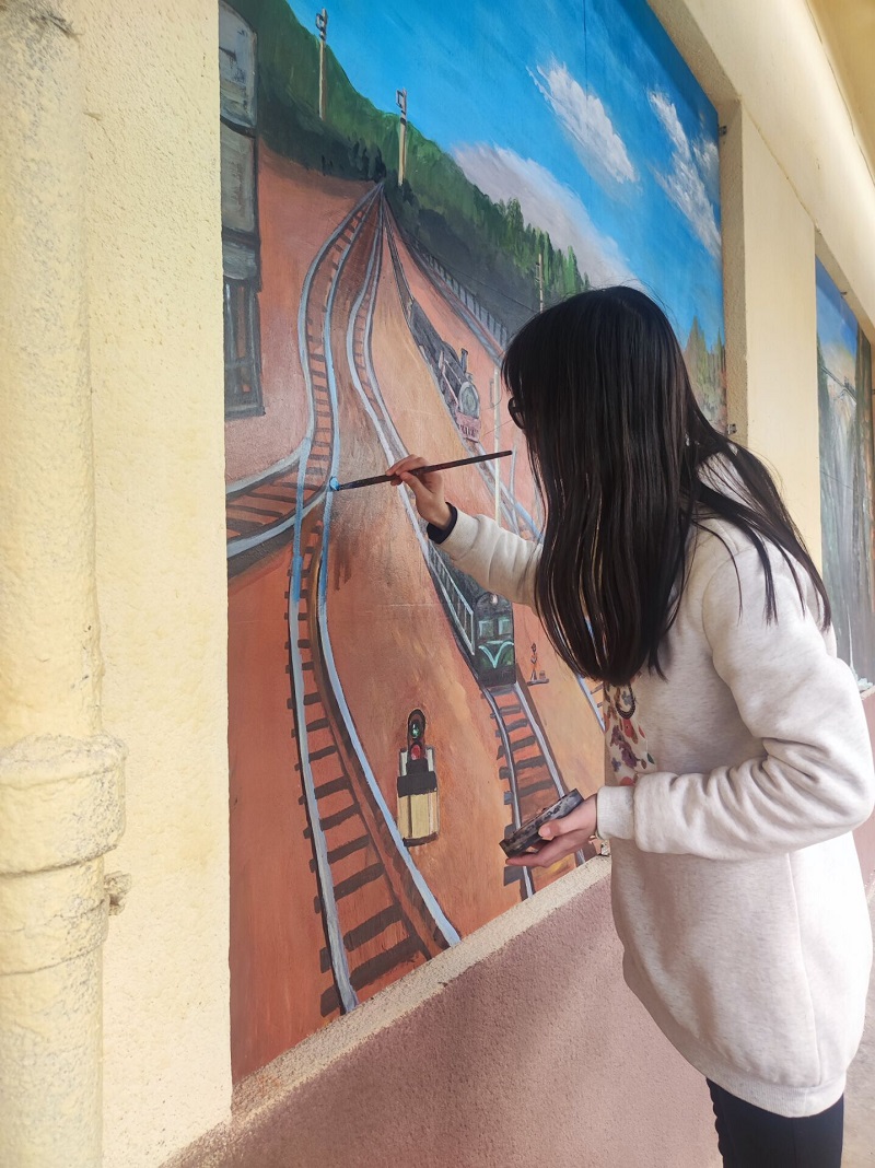 1月24日,深蓝学院应用统计学1班的毕思颖同学受铁路老馆长之托在云南昆明滇越铁路边画墙画,让已经荒废的乡村吸引更多游客来了解铁路乡村文化,振新乡村,铁路老馆长说:“滇越铁路是东南亚地区一条连接中国昆明和越南海防港(经中越口岸河口)的铁路,是中国西南地区的第一条铁路,曾被《英国日报》称之为与苏伊士运河、巴拿马运河相媲美的世界第三大工程。铁路承载新中国道路发展的历史、民族复兴的轨迹,如今更需要年轻一代来追溯历史,发扬中华民族艰苦奋斗创造美好生活的伟大精神。”通过此次墙画绘制,毕思颖进一步了解了当年铁路修建的艰辛、抗日战争的艰难和伟大,也进一步熟练了绘画的技法。