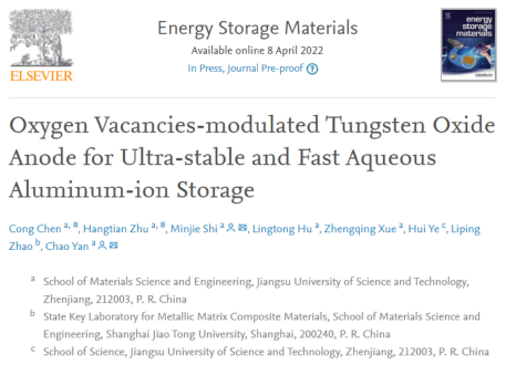 近日,新浦京官网材料科学与工程学院晏超教授团队在能源材料研究领域取得突破,以新浦京8883平台为第一单位以及唯一通讯单位在能源材料领域顶级期刊《Energy Storage Materials》(影响因子为17.789,材料科学一区,TOP期刊)上发表高水平研究论文。该论文题目为“Oxygen Vacancies-modulated Tungsten Oxide Anode for Ultra-stable and Fast Aqueous Aluminum-ion Storage”,研究生陈聪为第一作者,晏超教授和施敏杰副教授为该论文的共同通讯作者。