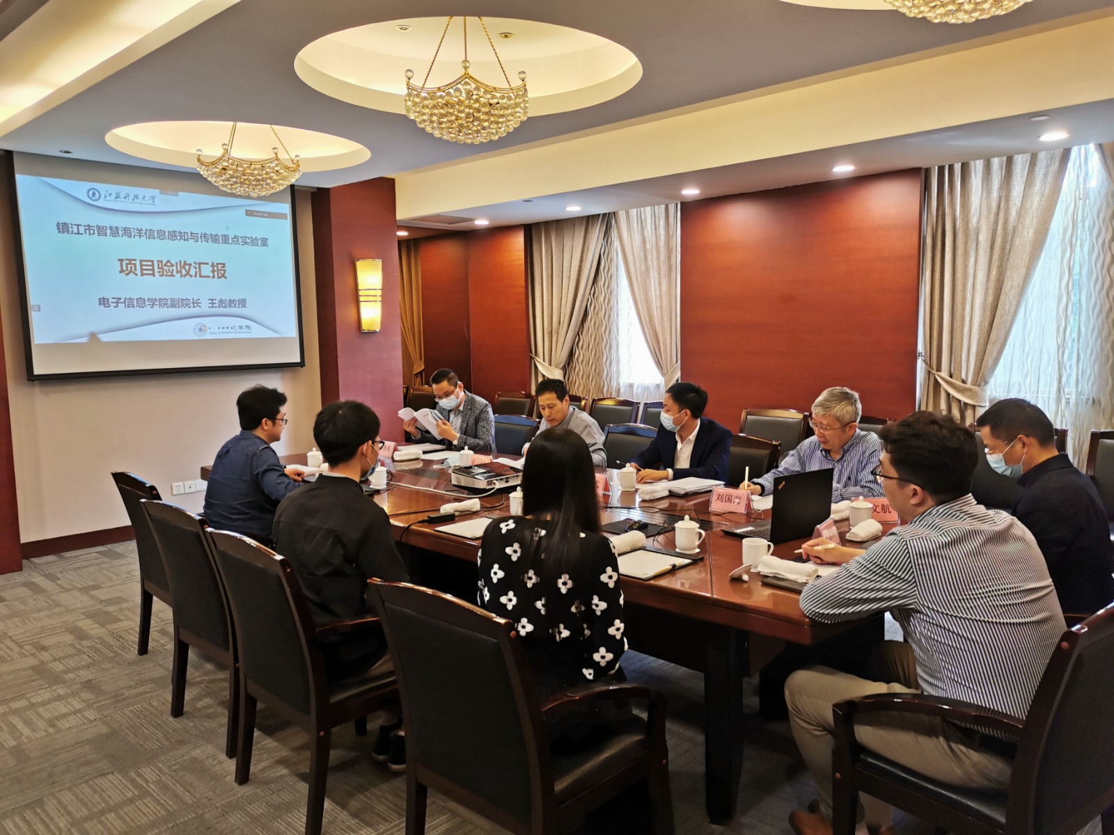 5月7日上午,镇江市科技局组织相关专家在观海楼第一会议室举行新浦京8883平台海洋学院“镇江市智慧海洋信息感知与传输重点实验室”验收会,按照疫情防控要求,会议采用线上和线下相结合的方式进行。项目验收委员会由中国科学院声学研究所、南京航空航天大学、河海大学、江苏大学、镇江公信会计事务所的5位专家组成,现场参会的江苏大学刘国海教授担任验收委员会主任。镇江市科技局王强处长、马弋副处长,学校科技处周宏根处长、黎文航副处长,海洋学院王彪副院长等出席验收会议。