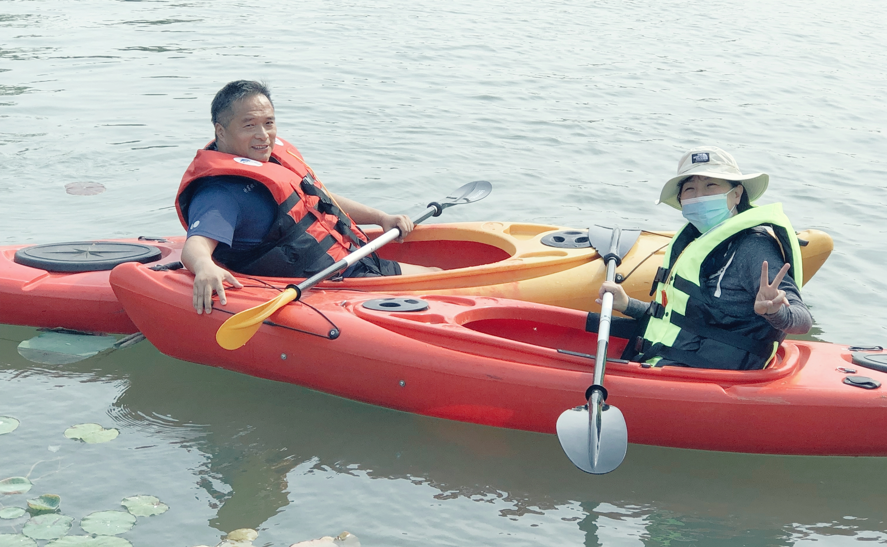 虽然很多老师是第一次体验皮划艇,但在专业游泳救生员的保护及指导下很快就找到感觉,展现各自矫健的身姿,奋楫前行,整个湖上洋溢着欢声笑语。在活动过程中,大家互相交流经验、心得体会,欣赏湖中美丽风景,在学到水上运动知识和技能的同时还增进了感情。